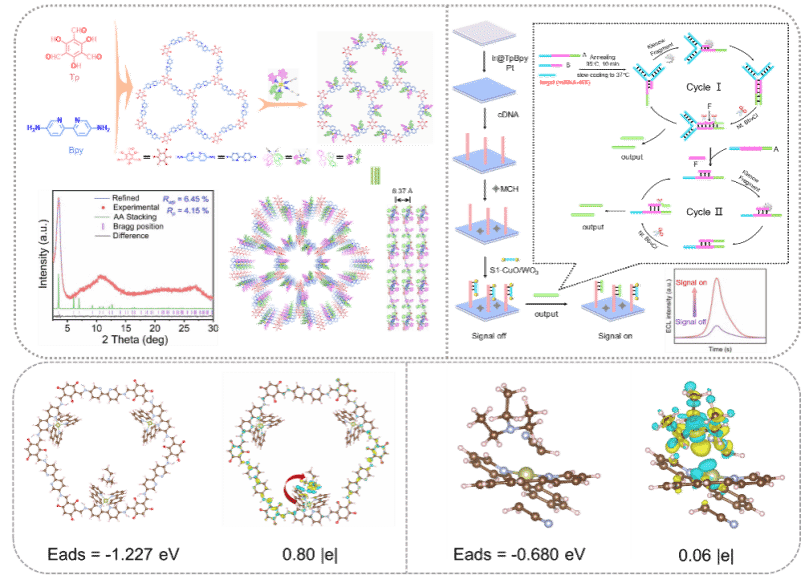 该研究成功构建了一种基于后金属化共价有机框架(COF)与Y型DNA级联扩增技术的超灵敏电化学发光(ECL)生物传感器,实现了对急性心肌梗死关键标志物miRNA-499的高精度检测,为重大疾病的早期诊断提供了可靠的技术平台。该研究通过后修饰策略将铱(III)配合物精准配位至联吡啶基COF(Ir@TpBpy)孔道中,利用COF固有的π-共轭骨架构建连续电荷传输通路,并借助其有序多孔结构对共反应剂三乙胺(TEA)产生显著的客体限域效应。密度泛函理论计算证实,Ir@TpBpy对TEA的吸附能大幅提升,有效富集了自由基中间体并加速了电子转移动力学,从而实现了ECL信号的本征放大。同时,研究引入了由Klenow片段与Nt.BbvCI酶驱动的Y型DNA自持式链置换扩增策略,将单分子miRNA识别事件转化为指数级增长的输出链信号,通过置换电极表面预固定的WO3/CuO异质结淬灭剂,触发“信号开启”响应。