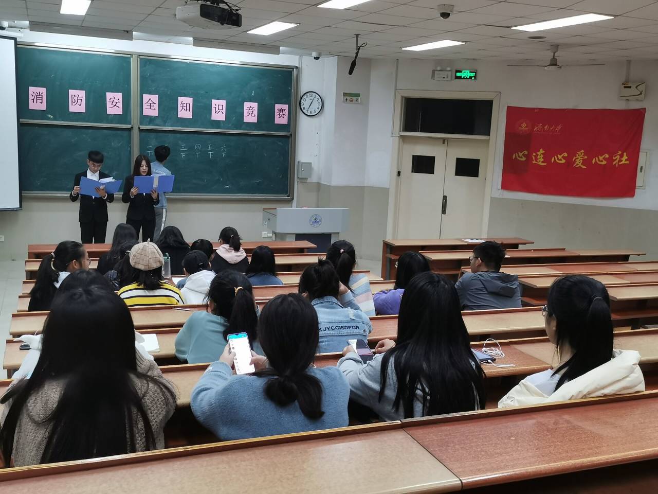 秋风送爽,红叶飞扬,济南大学也迎来了消防安全月。消防安全是大学工作中的重中之重,为进一步强化大学生的消防安全意识,丰富消防安全知识,提高消防自护能力,并进行消防安全宣传教育,济南大学心连心爱心社于11月14日晚7点至9点30分在第十一教学楼1301教室举行“消防知识入我心,安全校园共营造”消防安全知识竞赛活动,旨在以知识竞赛的形式让学生了解和掌握更多的消防安全小知识,提高大家的安全意识。2020级部分同学参加了此次竞赛活动。