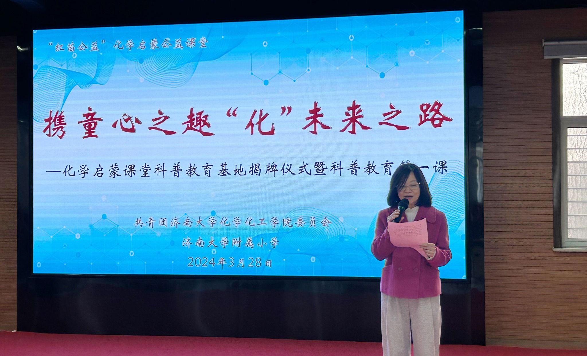 为全面落实团十九大关于中国青年志愿者行动相关工作部署,近日,化学化工学院与基础教育中心联合举办的“携童心之趣,‘化’未来之路”化学启蒙课堂科普教育基地揭牌仪式暨科普教育第一课启动仪式在创业学院路演大厅举行。化学化工学院党委书记贺铭、基础教育中心党委书记、主任张峰、校团委副书记梁明潜、化学化工学院党委副书记、副院长白雪飞、济南大学附属小学校长严婷,相关负责人及低、中、高段家委会代表100余人出席本次活动。