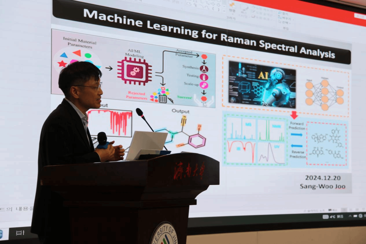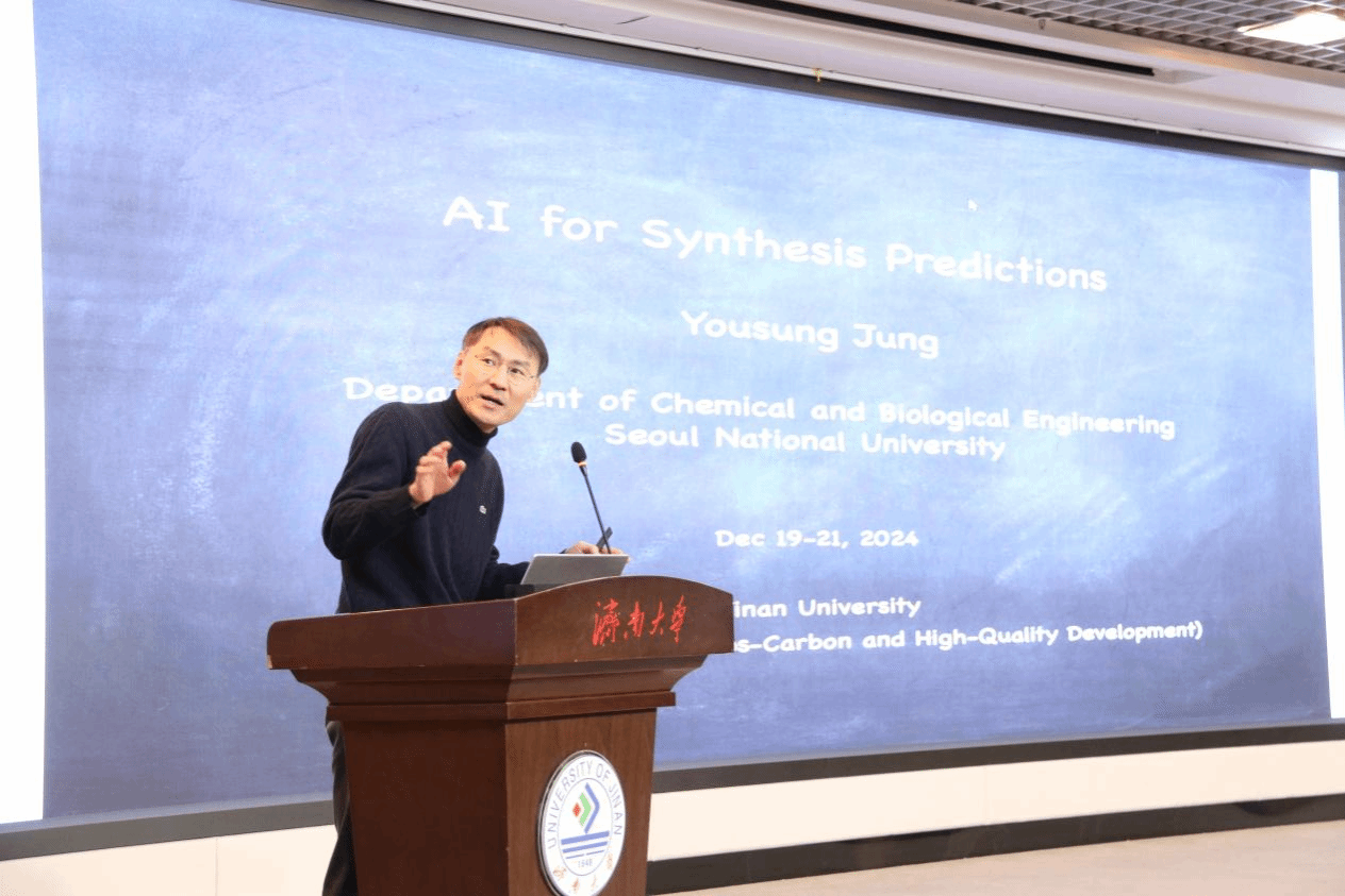 为深入贯彻落实黄河流域生态保护和高质量发展重大国家战略,服务山东省绿色低碳高质量发展先行区建设,进一步推动AI+化学领域国际人才交流与合作,1219-21日,由山东省科技厅、济南市科技局指导,济南大学主办的AI+化学促进低碳高质量发展齐鲁国际讲堂在济南举办。济南大学党委副书记、校长刘宗明,安徽工业大学党委常委、副校长、国家杰出青年基金获得者曾杰教授,韩国成均馆大学终身教授、韩国科学技术翰林院副院士Jin Yong Lee教授,郑州大学国家级领军人才周震教授,加拿大西安大略大学丁志峰教授,华东理工大学朱学栋教授,中国科学研究院化学研究所曹昌燕研究员,韩国首尔国立大学Yousung Jung教授,韩国崇实大学Sang-Woo Joo教授,韩国成均馆大学Jong Hyeon Lim博士等专家和领导出席大会,来自山东大学、齐鲁工业大学、曲阜师范大学、枣庄学院、山东金城医药集团、济南天正环境科技有限公司等10余家高校、企业的代表,以及济南大学科技处、国际合作与交流处、化学化工学院负责人及师生代表近300人参加了本次会议。会议开幕式由济南大学党委常委、副校长张勇主持。