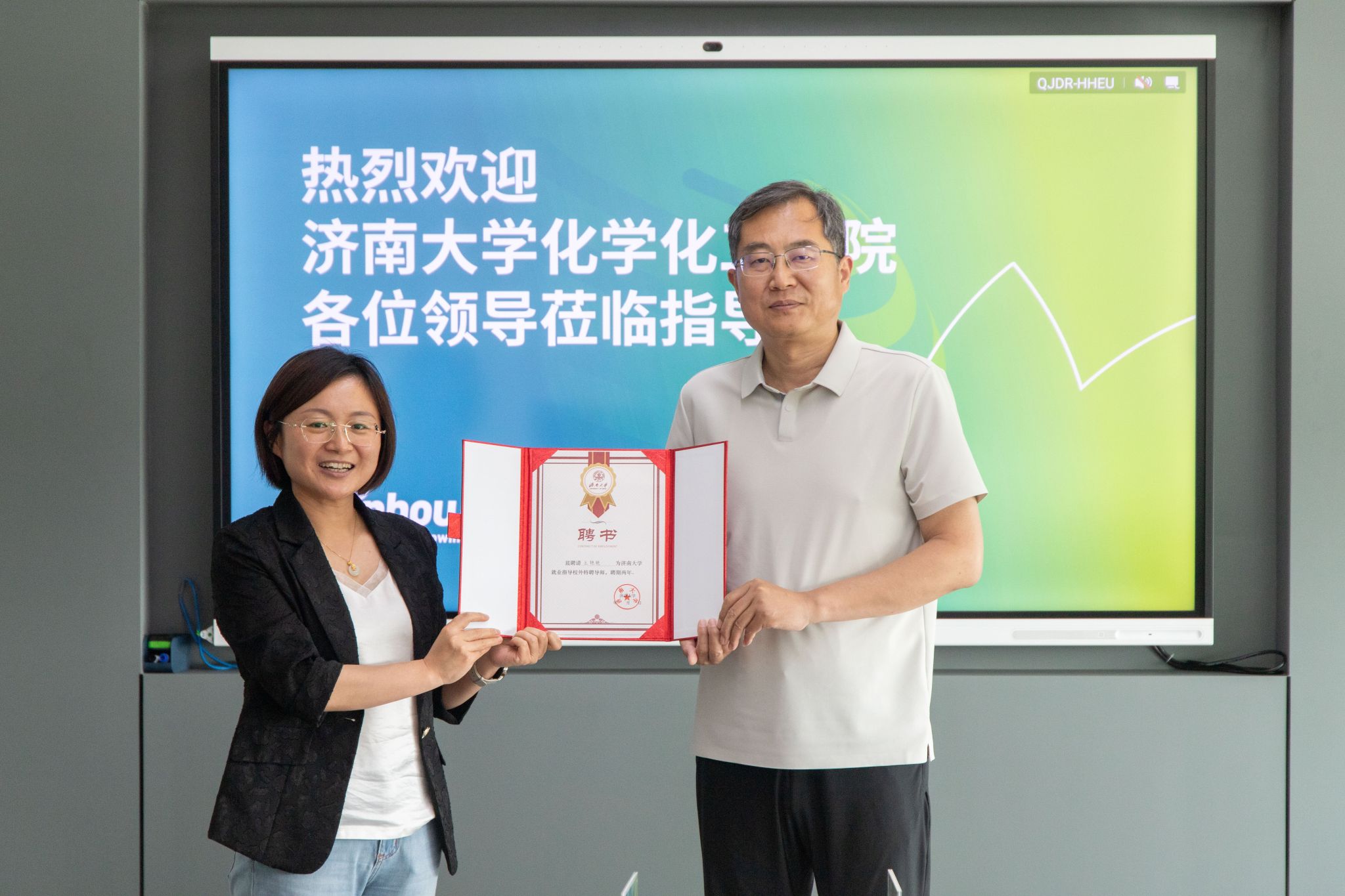 为促进校企资源对接,搭建人才共育平台,双方签署《济南大学毕业生就业实习基地》协议并揭牌,贺铭为润丰化工股份有限公司招聘经理王艳艳颁发济南大学“就业导师”聘书。