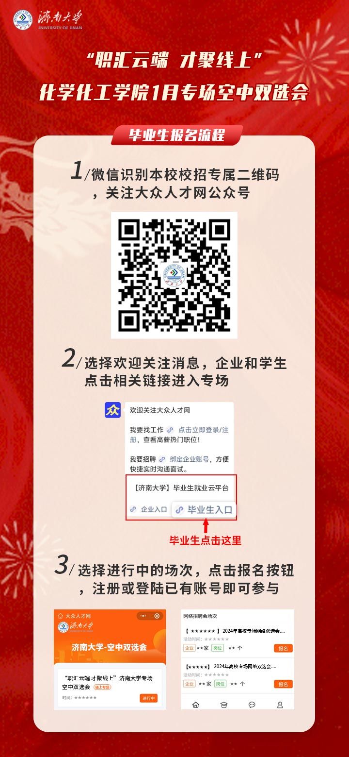 手机微信扫码关注“大众人才网”微信公众号,企业和毕业生分别点击相关按钮进入济南大学校招端口,点击本学院报名按钮,注册或登录已有账号即可直接参与。