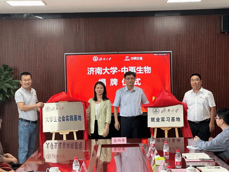 仪式上,化学化工学院党委副书记白雪飞与中再生生物科技有限公司总经理张玉民共同签署就业实习基地和社会实践基地协议。陈国柱、魏龙、白雪飞、张玉民共同为就业实习基地和社会实践基地揭牌。